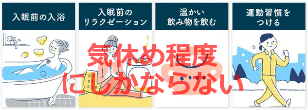 ストレスによる不眠症への対処法としてはよく挙げられますが、実はどれも即効性はほとんどありません。
